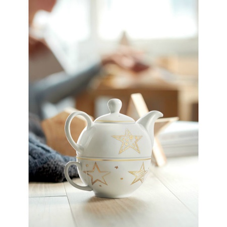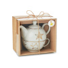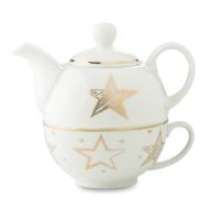 Заварной чайник и чашка, декорированные новогодними мотивами в подарочной упаковке