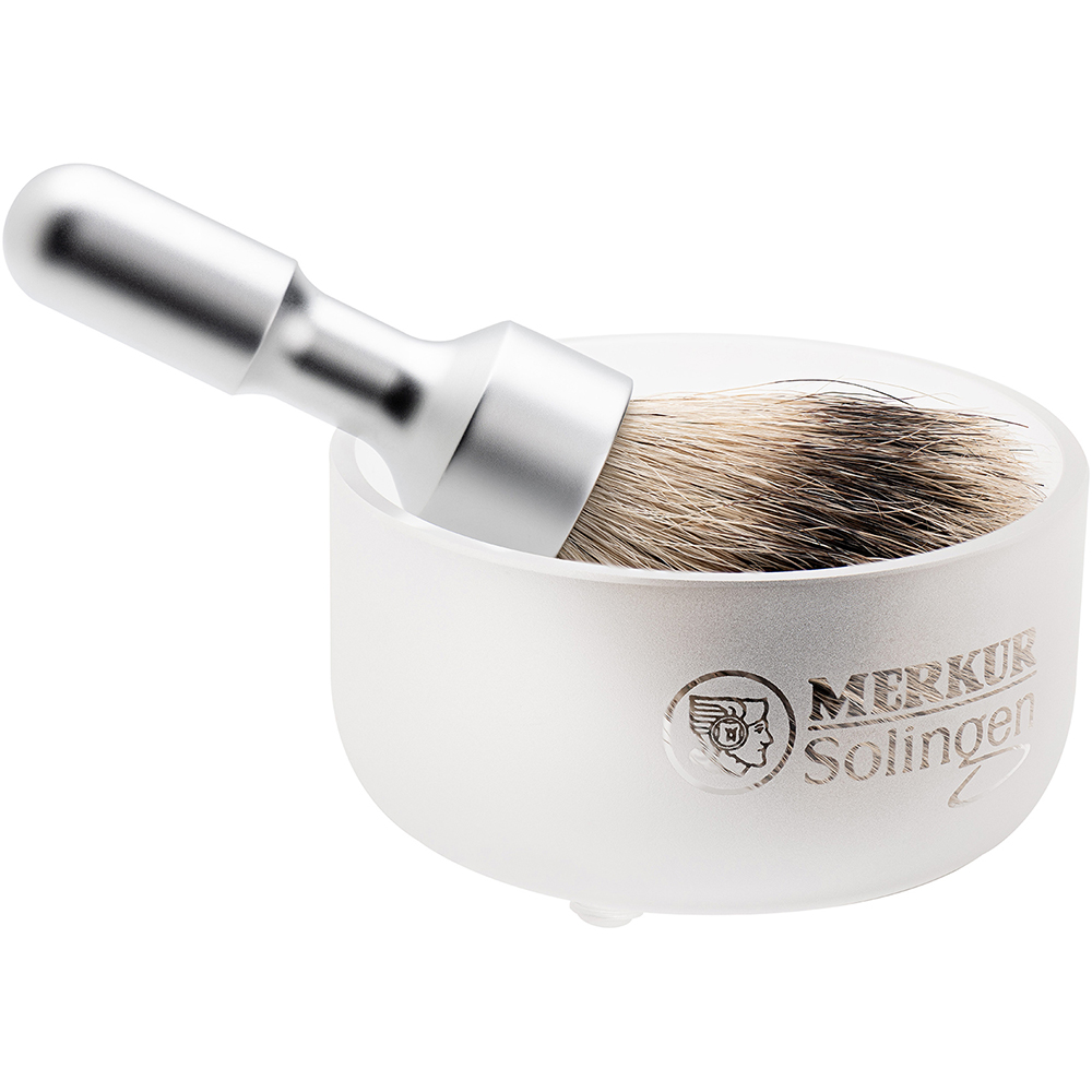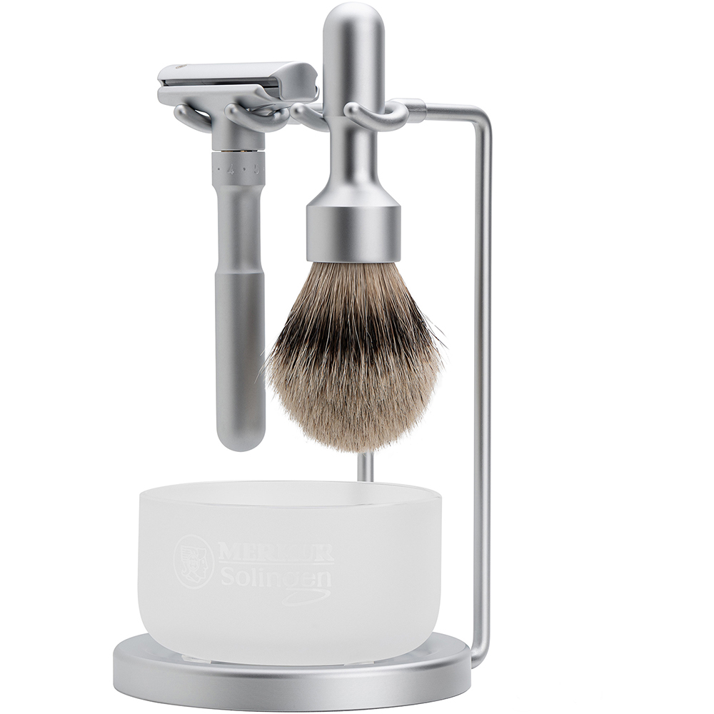 4 предмета: безопасная бритва 700002, помазок 1700002, стеклянная чаша, подставка, лезвия MERKUR SUPER PLATINUM 910010 (10 шт)