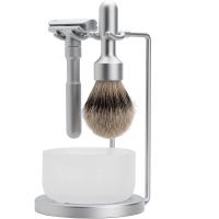 Мягкая и густая щетина помазка из натурального барсучьего ворса категории SILVERTIP с алюминиевой рукоятью идеально взбивает пену, заботясь о вашей коже и превращая каждое утро в ритуал комфорта и свежести. Стильная подставка придаёт набору завершённость и подчёркивает его исключительный статус.
