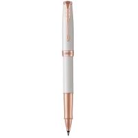 Ручка из престижного ассортимента полностью обновленной коллекции Sonnet: более современный дизайн зажима на колпачке (теперь три широких пера вместо пяти узких в предшествующем варианте), измененный торец на колпачке, широкое кольцо на колпачке теперь состоит из 3 соединенных вместе колец, на среднем выполнена гравировка логотипа PARKER. Корпус ручки-роллера выполнен из ювелирной латуни и покрыт жемчужным переливающимся глянцевым лаком, а детали дизайна покрыты розовым золотом. Зона захвата изготовлена из отполированной нержавеющей стали, также покрытой розовым золотом. Ручка поставляется в новой подарочной коробке, которая соответствует основным принципам премиальной упаковки. На боковой стороне коробки нарисованы гербы - подтверждение гарантии Британского Королевского двора.