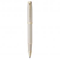 Ручка-роллер Parker из коллекции IM выполнена из нержавеющей стали и покрыта матовым лаком металлик цвета шампань. Декоративные элементы c отделкой PVD. Ручка упакована в оригинальную картонную подарочную коробку Parker. В комплекте идет стержень роллер черного цвета, он находится под платформой с ручкой.