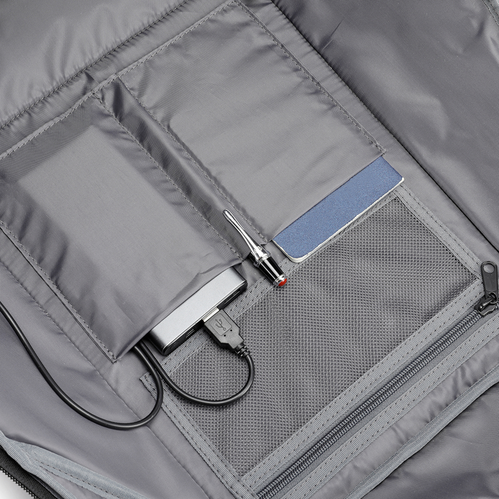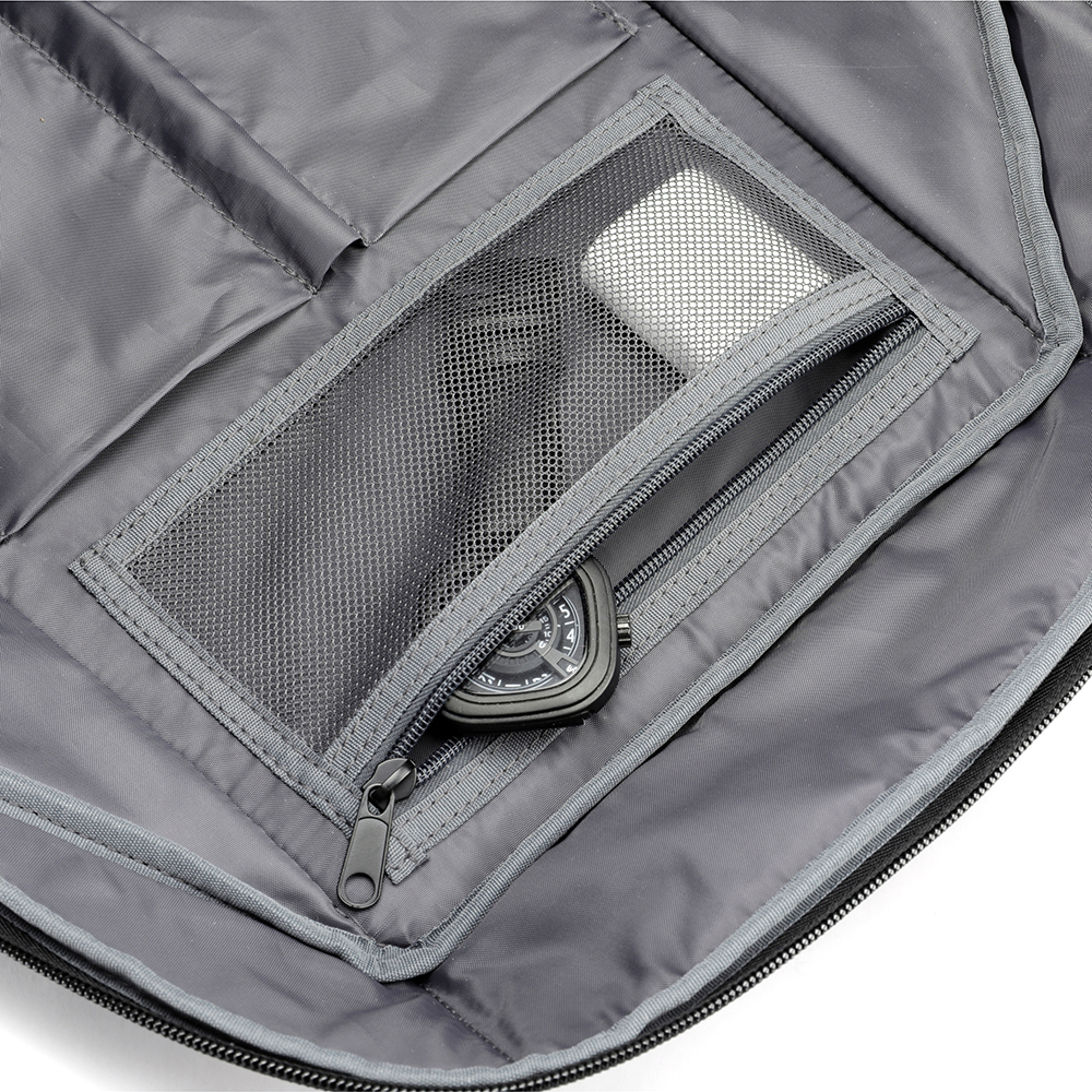 Одно большое отделениие закрывается молнией со скрытым звеном. Внутри уплотнённый карман для ноутбука 15,6 дюймов, карман-органайзер для аксессуаров и ЭКСКЛЮЗИВНАЯ ОПЦИЯ - специальный карман-сетка ДЛЯ АРОМАСАШЕ.