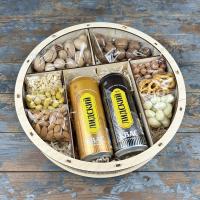 Набор "Хруст и хмель" — это превосходный выбор для ценителей гармоничного сочетания лаконичности и утончённого вкуса. В элегантной деревянной коробке с аккуратными перегородками собраны отборные сорта орехов, которые идеально сочетаются с освежающим квасом или любым другим напитком на ваш вкус ( в наборе идет 2 банки кваса). Этот набор станет универсальным подарком для любого повода: будь то тёплый вечер в кругу семьи, весёлая дружеская встреча или просто желание насладиться вкусным моментом. "Хруст и хмель" — это сочетание отменного вкуса, уюта и хорошего настроения в одном наборе.