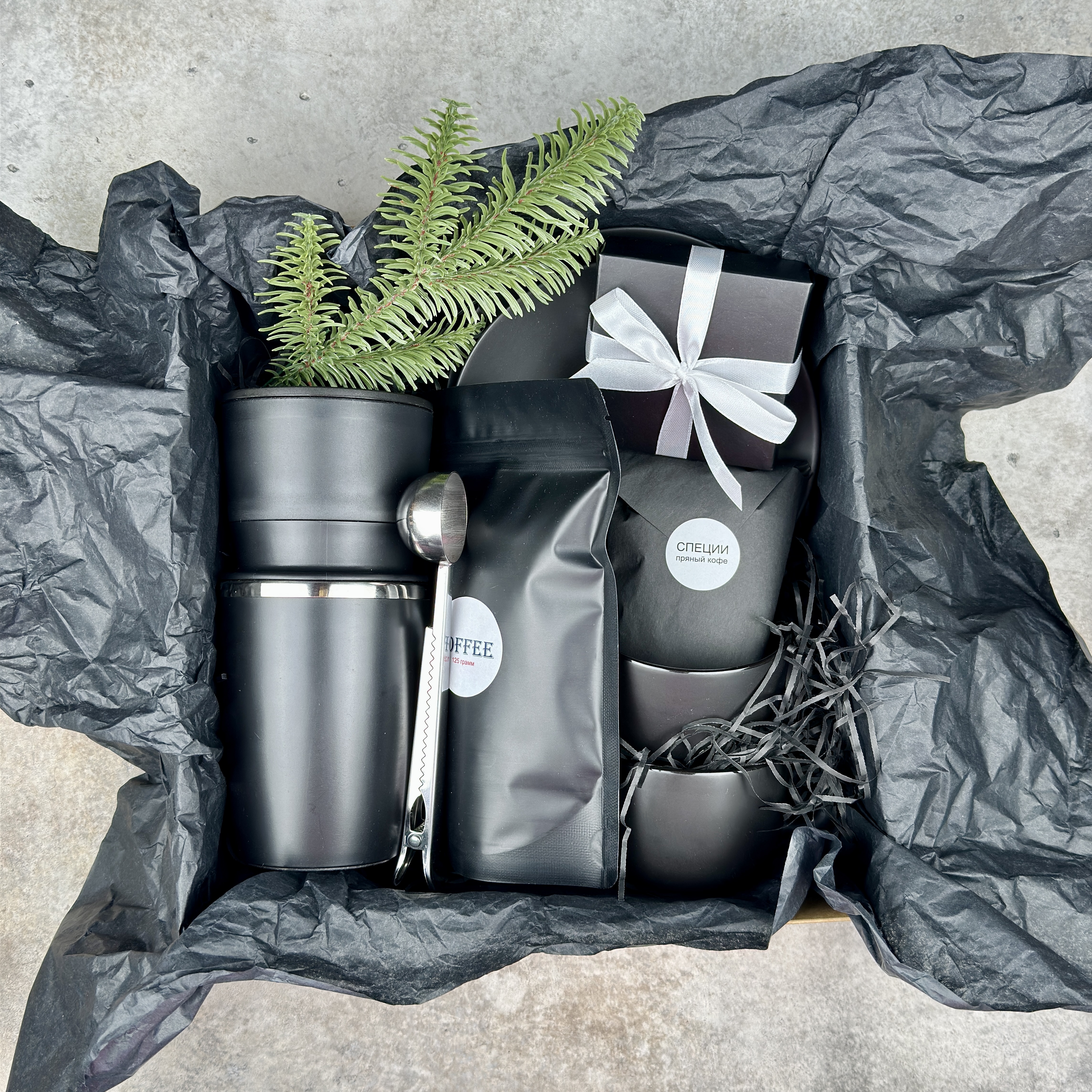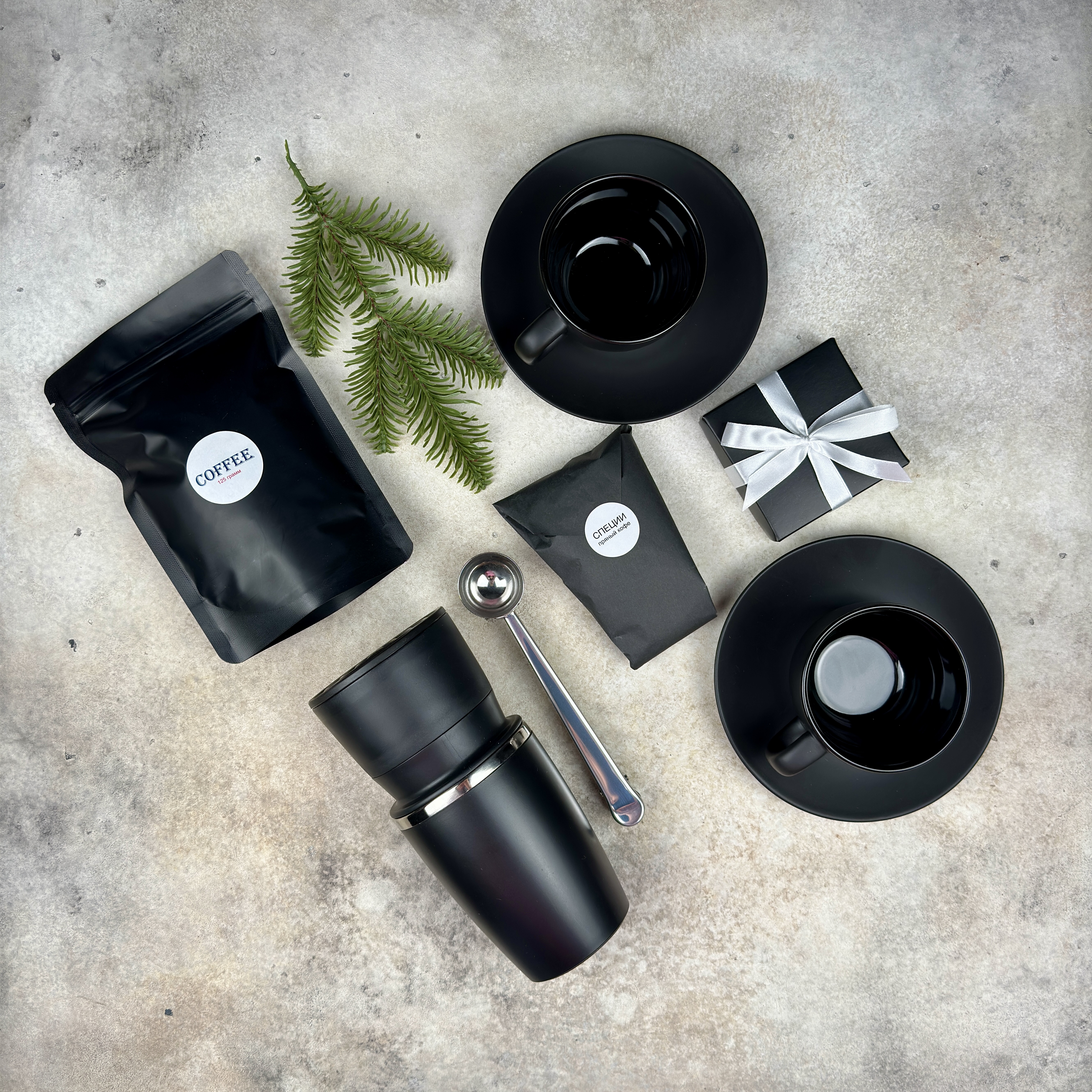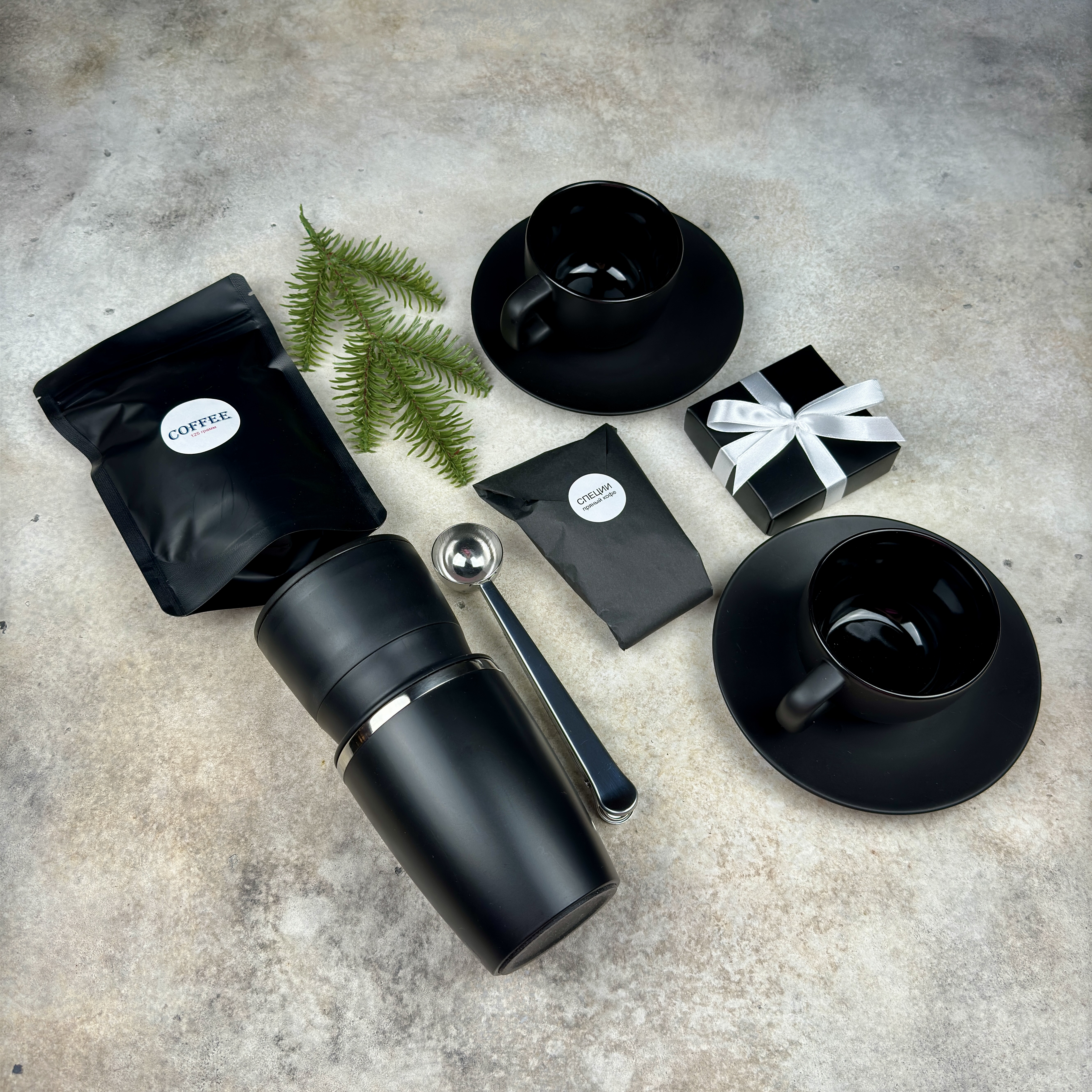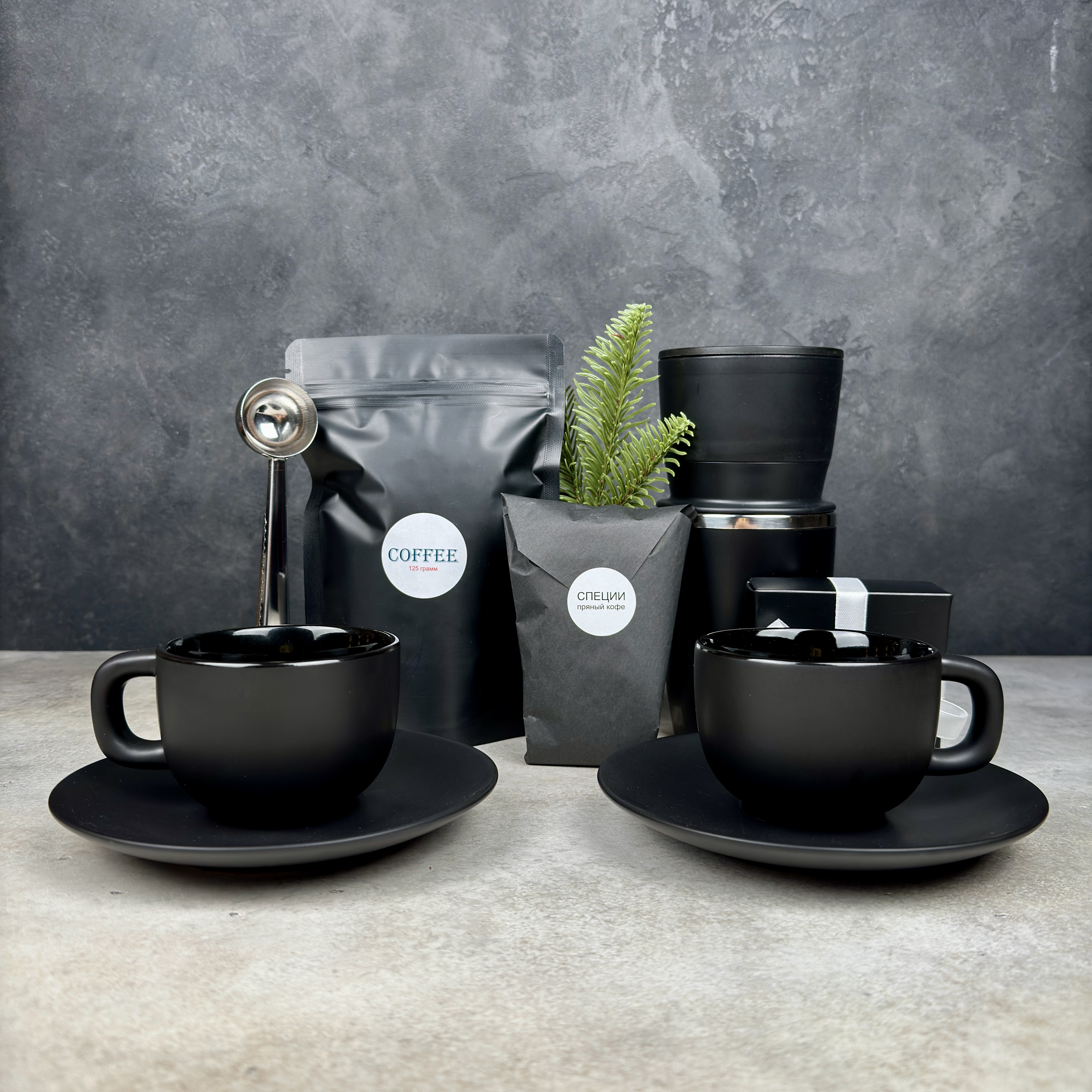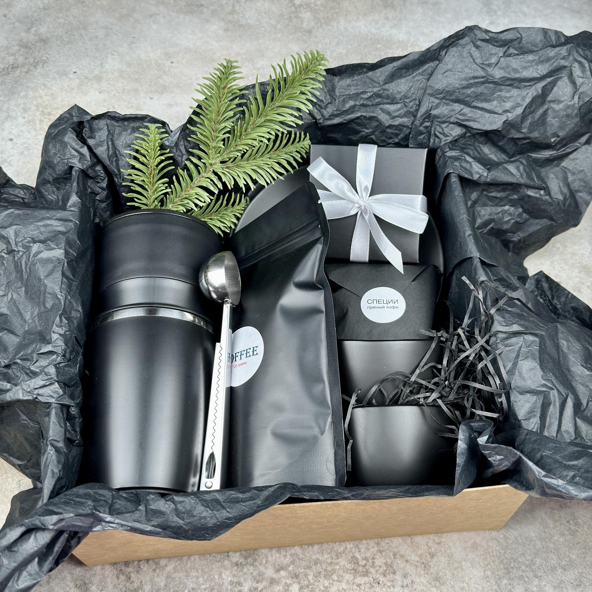 Набор позволяет превратить обычный кофебрейк в маленький ритуал: смолоть зерно, заварить его через воронку и сразу отправиться по делам с горячим напитком, который долго остаётся тёплым. Атмосферу усиливают пряные специи и лёгкий перекус, а две чёрные кофейные пары создают настроение неспешного общения — для утреннего кофе вдвоём дома или для стильной сервировки в офисе.