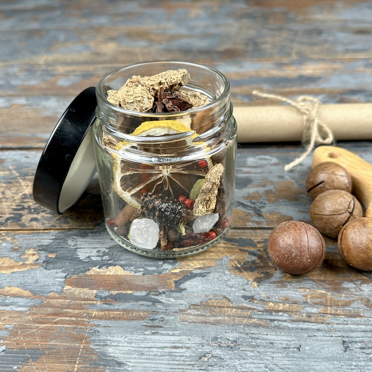 Погрузитесь в теплую атмосферу уютного вечера с подарочным набором "Лесной Глинтвейн". В комплекте собраны все необходимые ингредиенты для создания ароматного напитка: натуральные специи для глинтвейна с настоящими еловыми шишками, изысканные орехи макадамия, удобная деревянная сервировочная доска и подробный рецепт, который поможет вам приготовить идеальный глинтвейн.