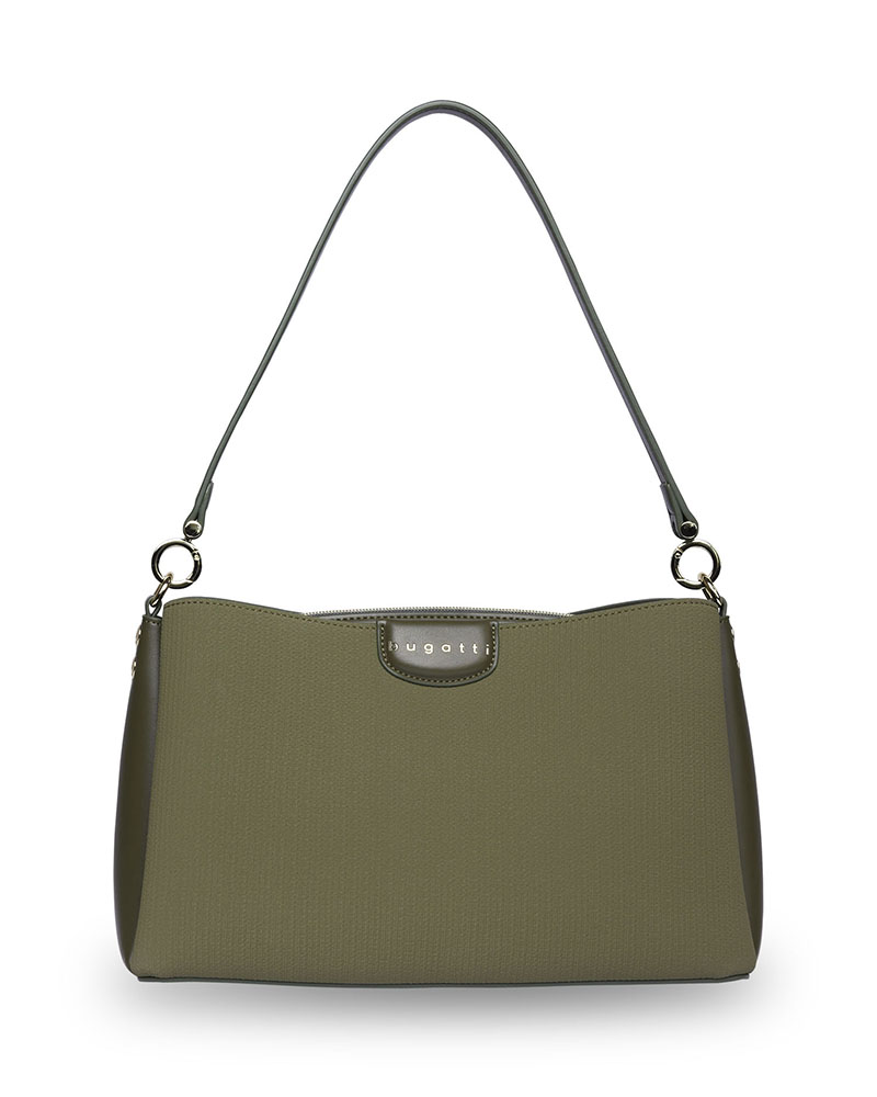 Универсальная и стильная: благодаря короткой ручке с круглыми люверсами сумку можно элегантно носить в руке, а регулируемый плечевой ремень превращает ее в повседневную модель через плечо. Цвета коллекции – черный, бежевый и оливковый - идеально сочетаются с светло-золотистой фурнитурой и рельефным тиснением логотипа bugatti.