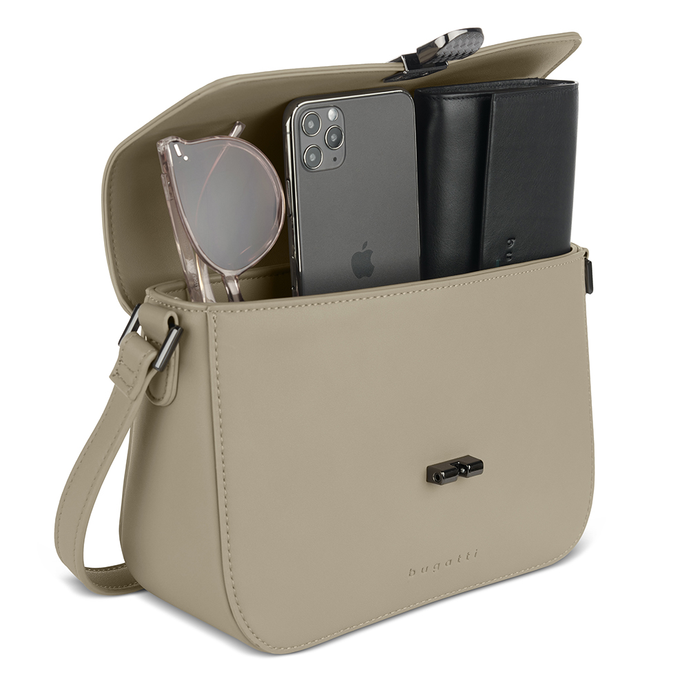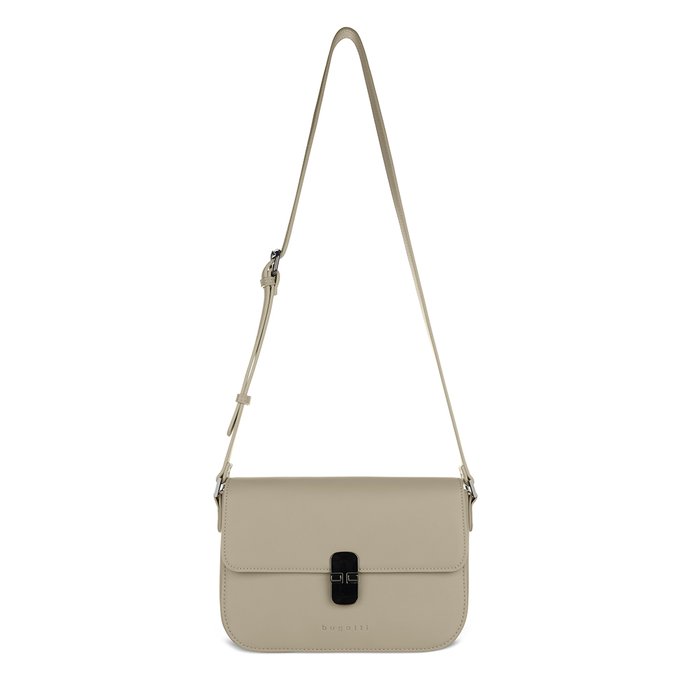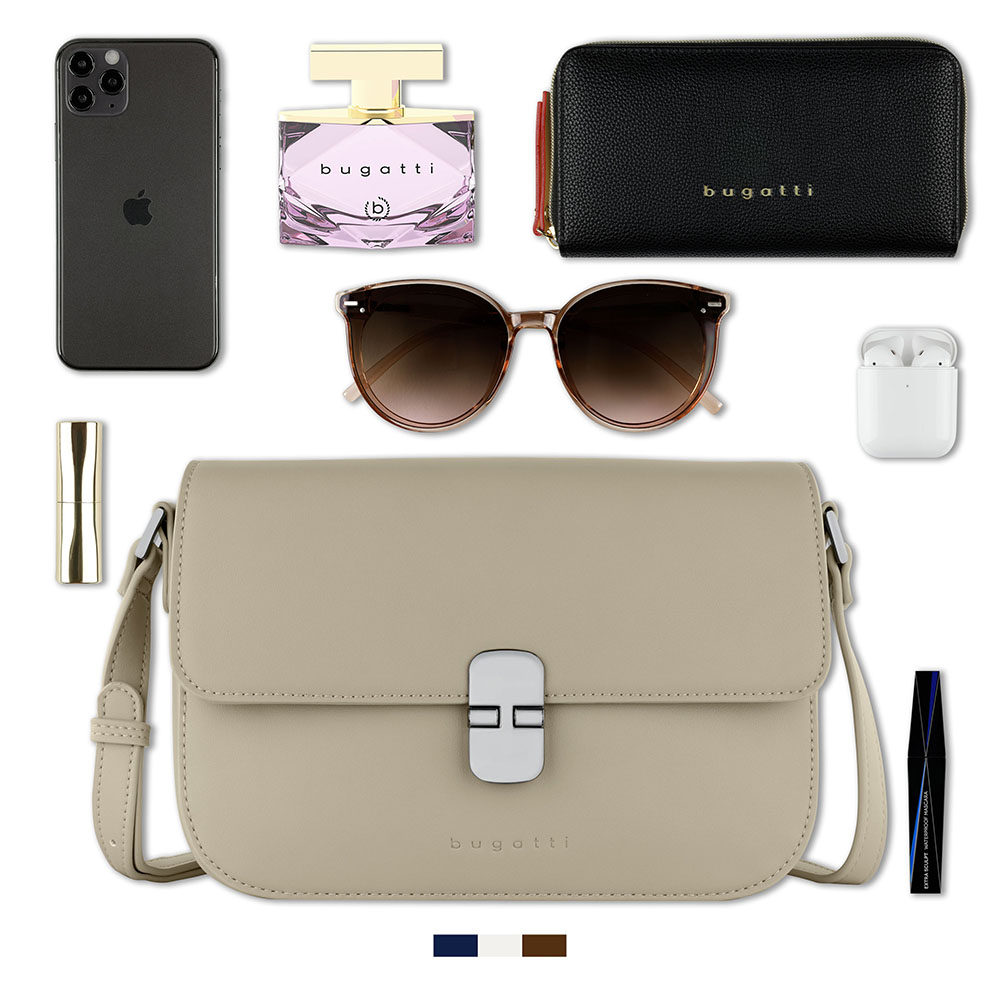 Цветовая палитра включает глубокий черный и нежный бежевый – оттенки, которые легко комбинируются с любым гардеробом. Серебристая фурнитура, металлическая пряжка и изящное тиснение логотипа bugatti идеально дополняют образ.