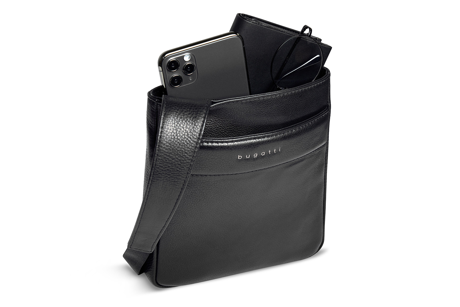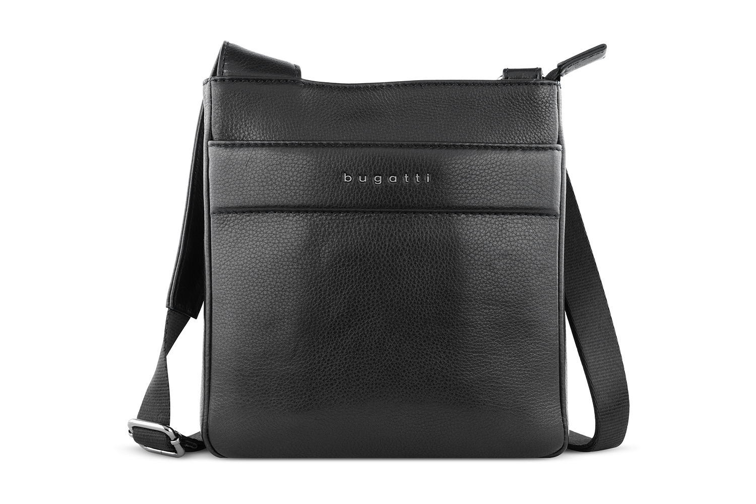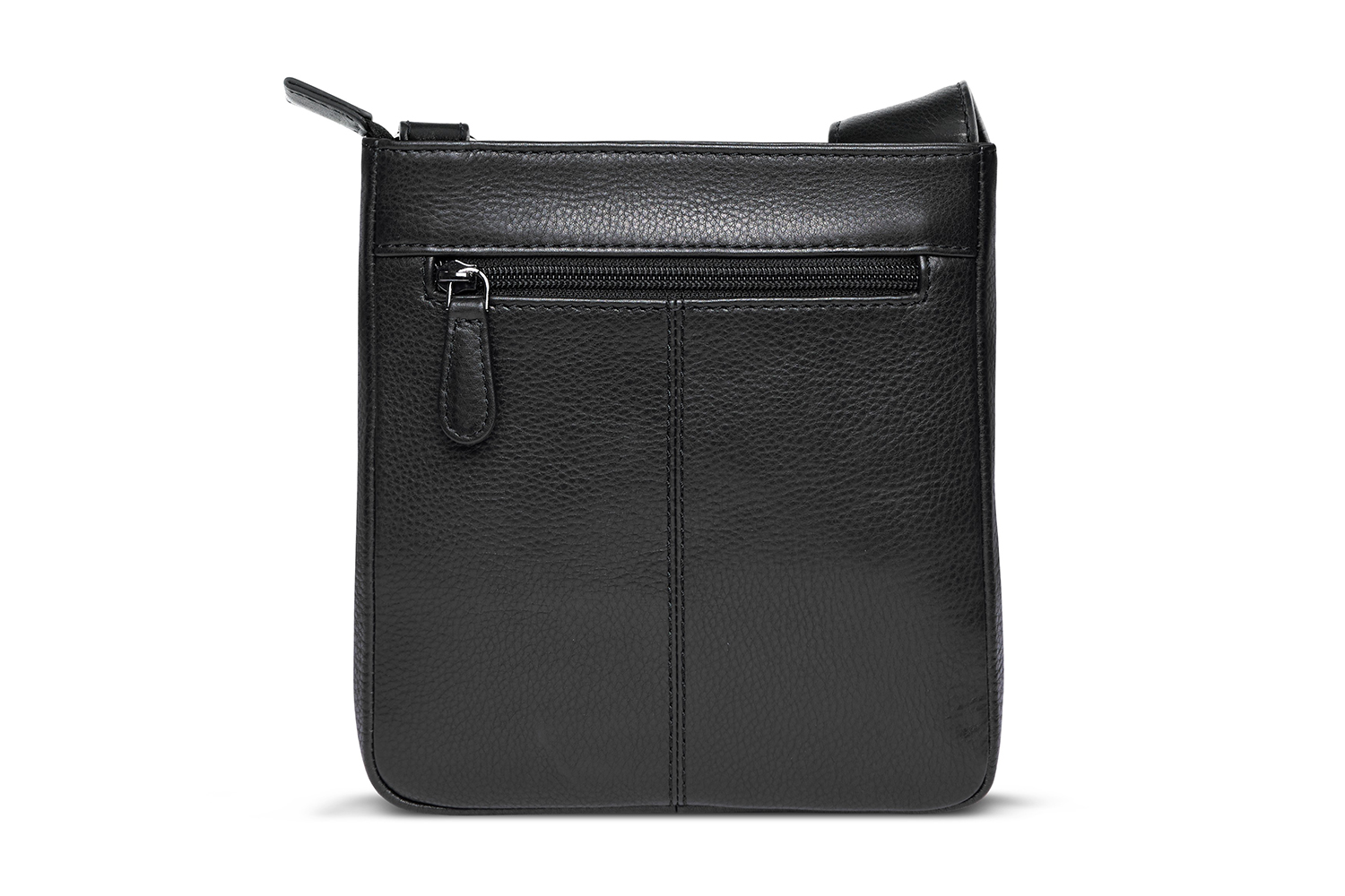 Функциональная организация: основное отделение на молнии с открытым карманом и внутренним отделением на молнии, передний карман, задний карман на молнии, регулируемый плечевой ремень.