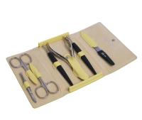 В набор входят: ножницы для ногтей, ножницы для кутикулы, кусачки для ногтей, шабер - копье, шабер - лопатка, пинцет наклонный, пилка металлическая.