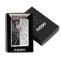 На этой зажигалке Zippo Classic High Polish Chrome краснолапый паук выползает из шероховатой тени цветного изображения на выгравированную паутину.