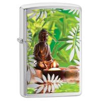 Зажигалка Zippo Classic с покрытием Brushed Chrome с изображением Будды, который отдыхает перед зажженной свечой в окружении листвы.