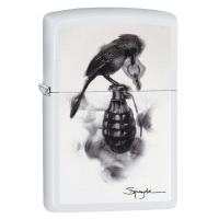 Стивен Спазук, канадский художник, известный своей техникой рисования «при помощи дыма и огня», является одним из преданнейших поклонников Zippo и иногда создает для любимых зажигалок гиперреалистичные и одновременно фантастические, будто навеянные снами, изображения. Долой суеверия, решил Стивена Спазук и вручил этой бесноватой птичке выдернутую чеку от гранаты. Кстати, в уголке внизу нашлось место для подписи художника на белом матовом фоне.
