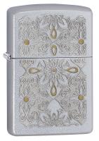 Серебристая зажигалка с изображенной на лицевой стороне гравюры в стиле филигрань с золотистыми вставками.