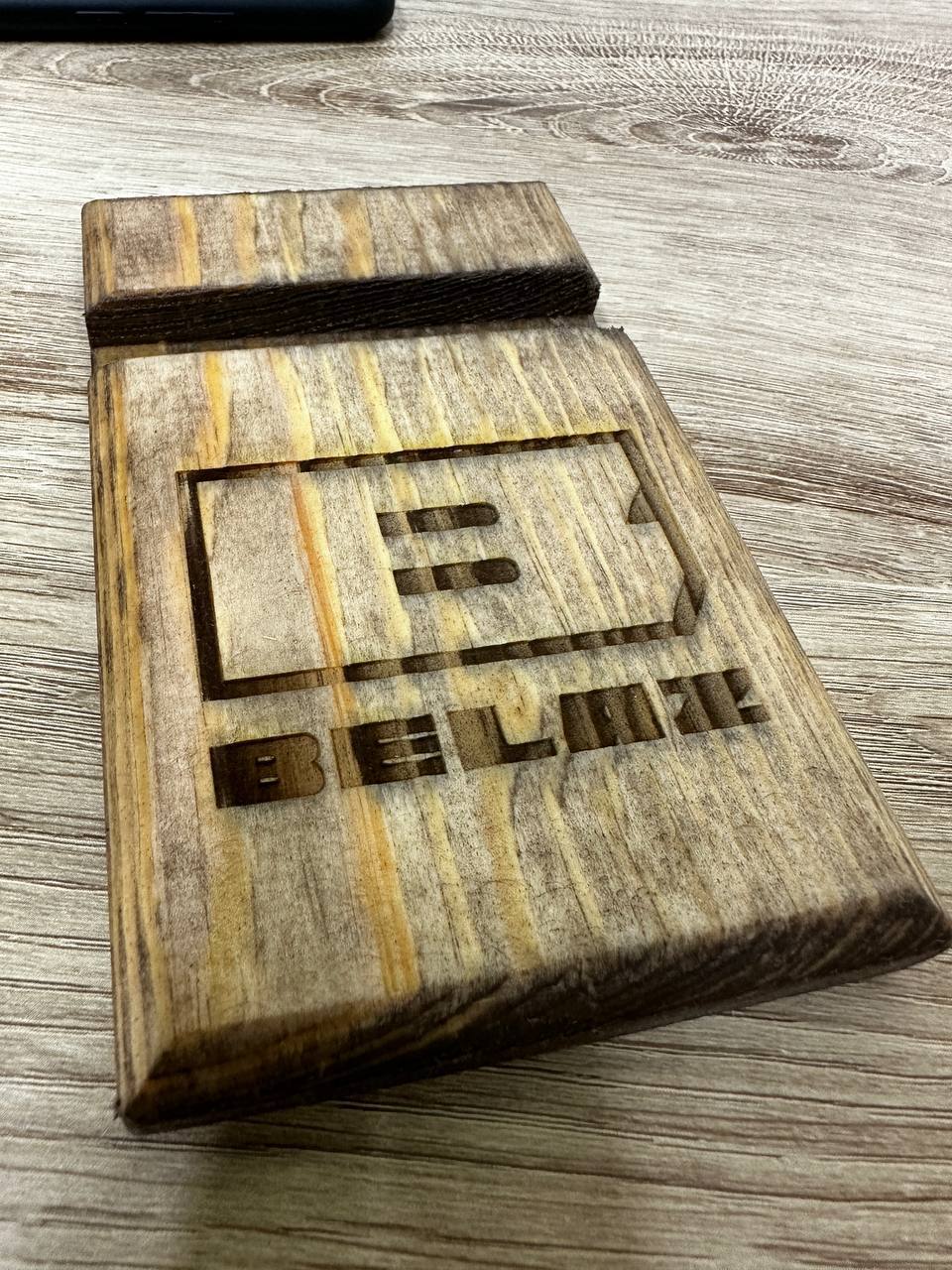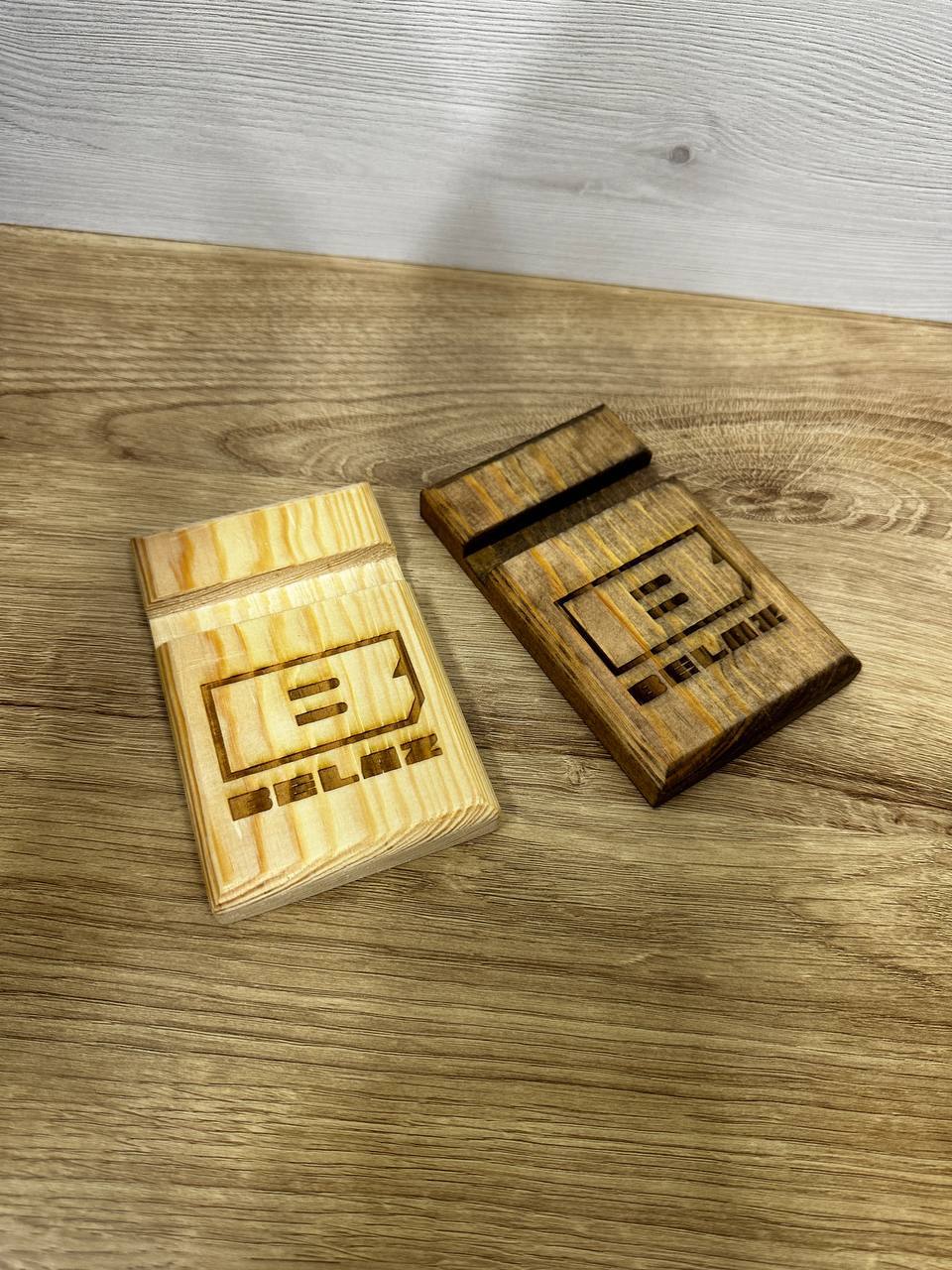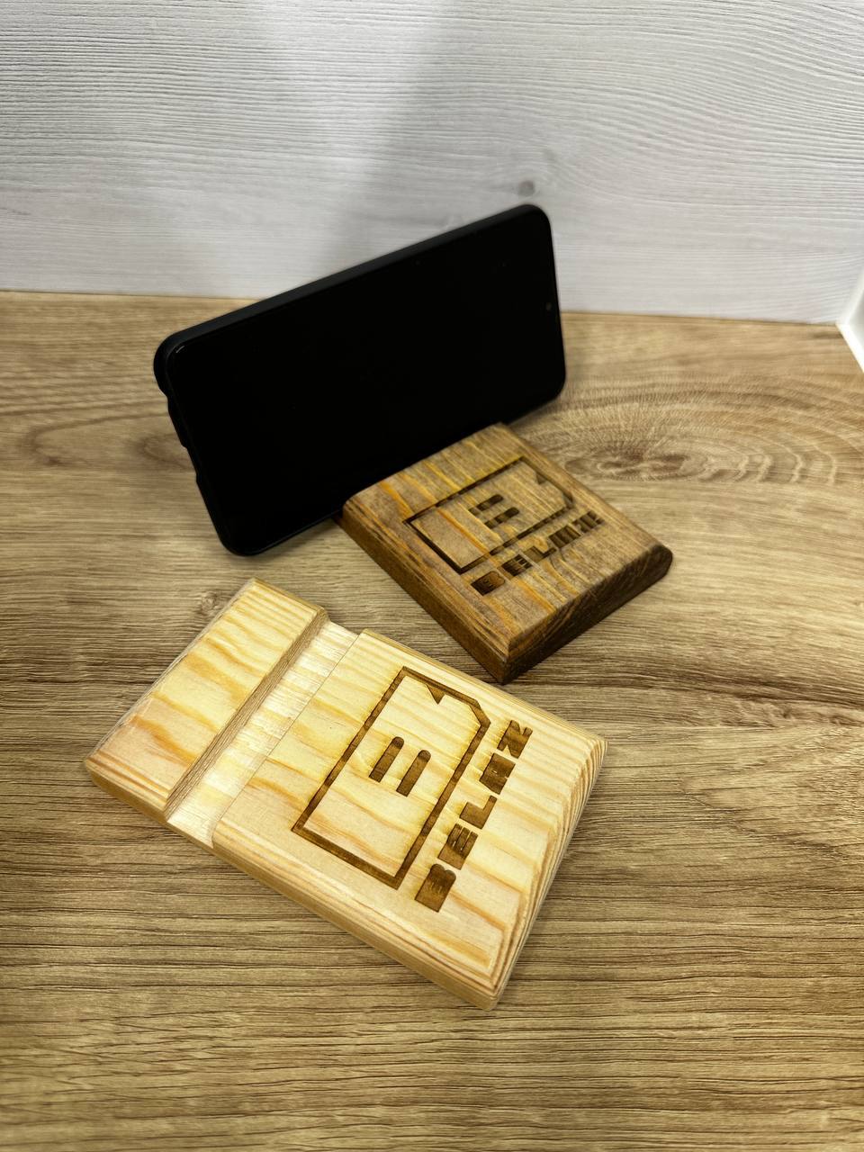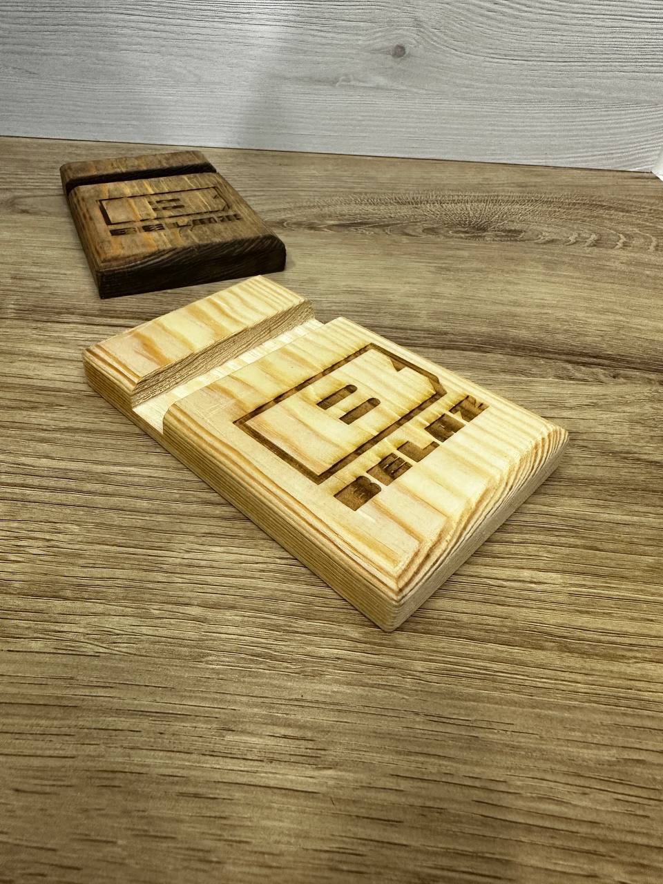 Мы разработали индивидуальные подставки для телефонов из натурального дерева, сочетающие в себе экологичность, ручную работу и фирменный стиль: